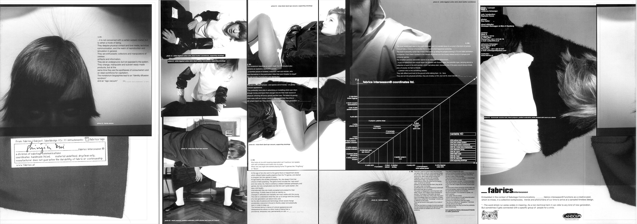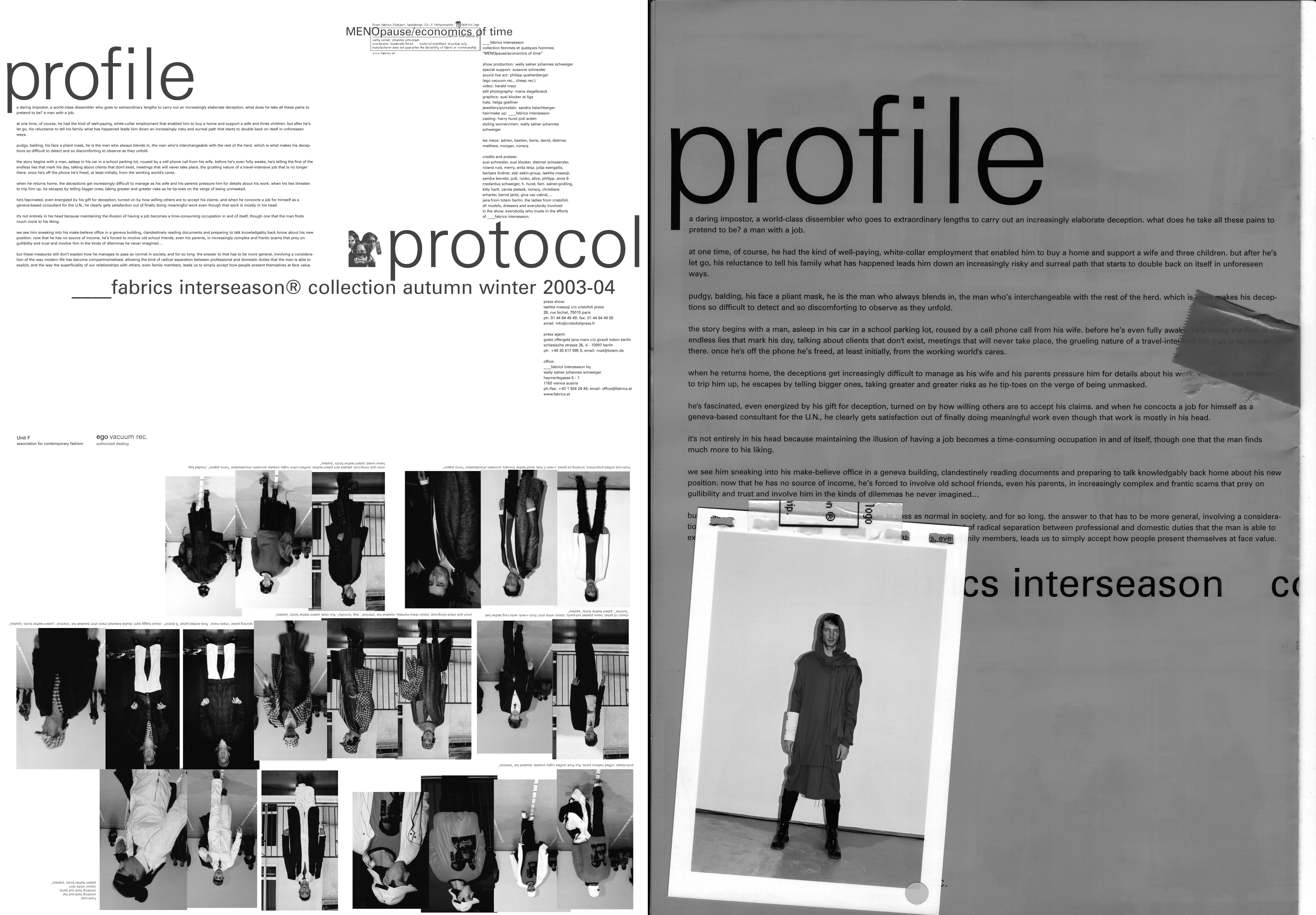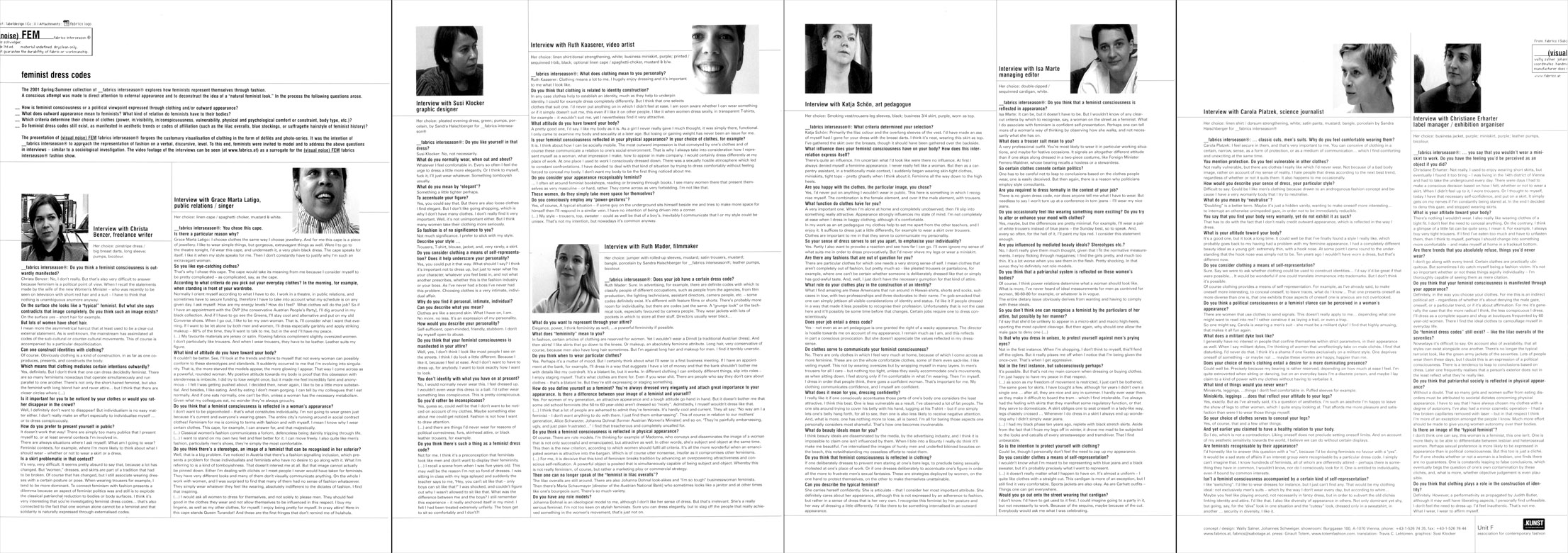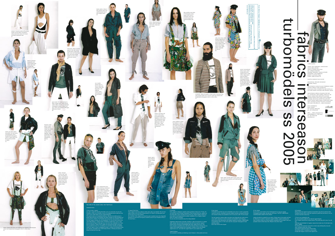 | O-DORF spring summer 07 photography maria ziegelböck, styling sabina schreder | | | PRODUCT PLACEMENT spring summer 06 photography maria ziegelböck, styling natascha hochenegg, graphics susi klocker | | | SCIENCE FICTION fall winter 05/06 photography maria ziegelböck, styling sabina schreder, graphics susi klocker | | | TURBOMÖDELS spring summer 05 photography maria ziegelböck, styling sabina schreder, graphics susi klocker | | | ADHOCRACY fall winter 04/05 photography maria ziegelböck, graphics susi klocker | | | TUPPERWARE spring summer 04 photography maria ziegelböck, graphics susi klocker | | | MENOpause ECONOMICS OF TIME fall winter 03/04 photography maria ziegelböck, graphics susi klocker | | | CONSTRUCTED NORMALITY #CLUB MED/CHLOR spring summer 03 photography maria ziegelböck, graphics susi klocker | | | CONSTRUCTED NORMALITY #MODERN NERVS (FOIE NOIR) fall winter 02/03 photography maria ziegelböck, graphics susi klocker | | | CONSTRUCTED NORMALITY #PROMESSE DU BONHEUR spring summer 02 photography maria ziegelböck, graphics susi klocker | | | LODGE fall winter 01/02 photography maria ziegelböck, graphics susi klocker | | | (visual noise) FEM spring summer 02 graphics susi klocker | | | EQUINOX fall winter 00/01 photography maria ziegelböck, graphics susi klocker | | | SHINJIN RUI 1998 photography ossi haller, graphics christoph steinegger | | | CASH 1998 photography guenther kresser, graphics christoph steinegger | |