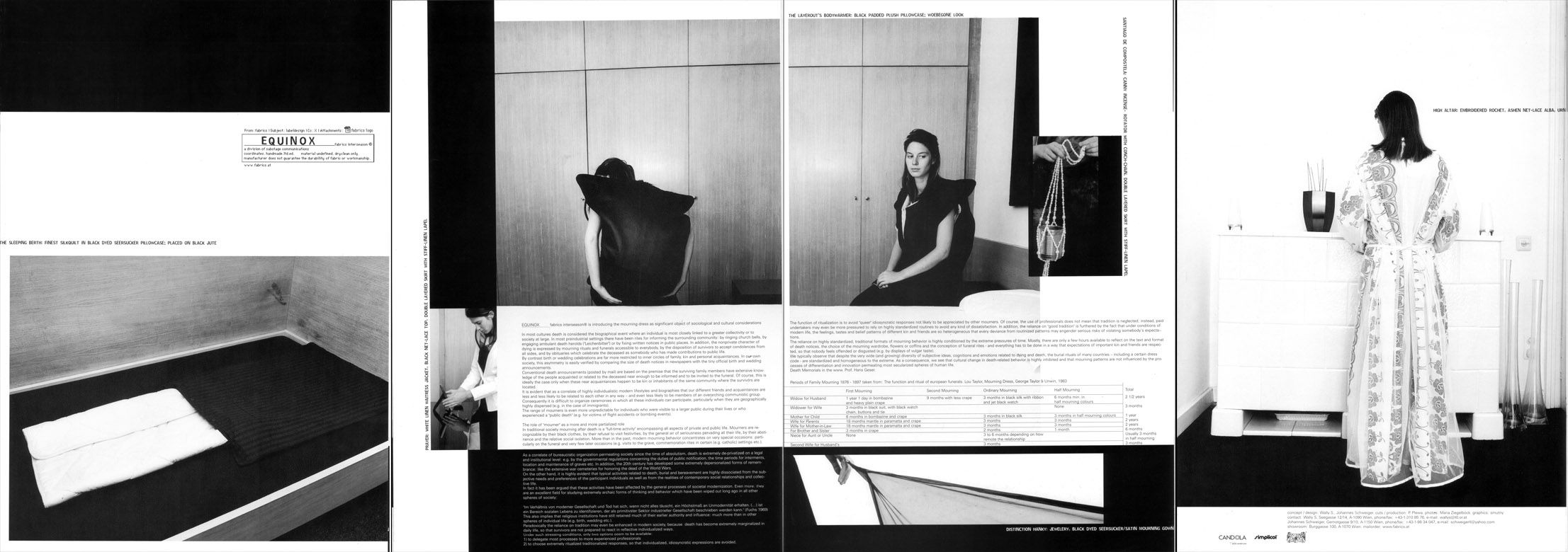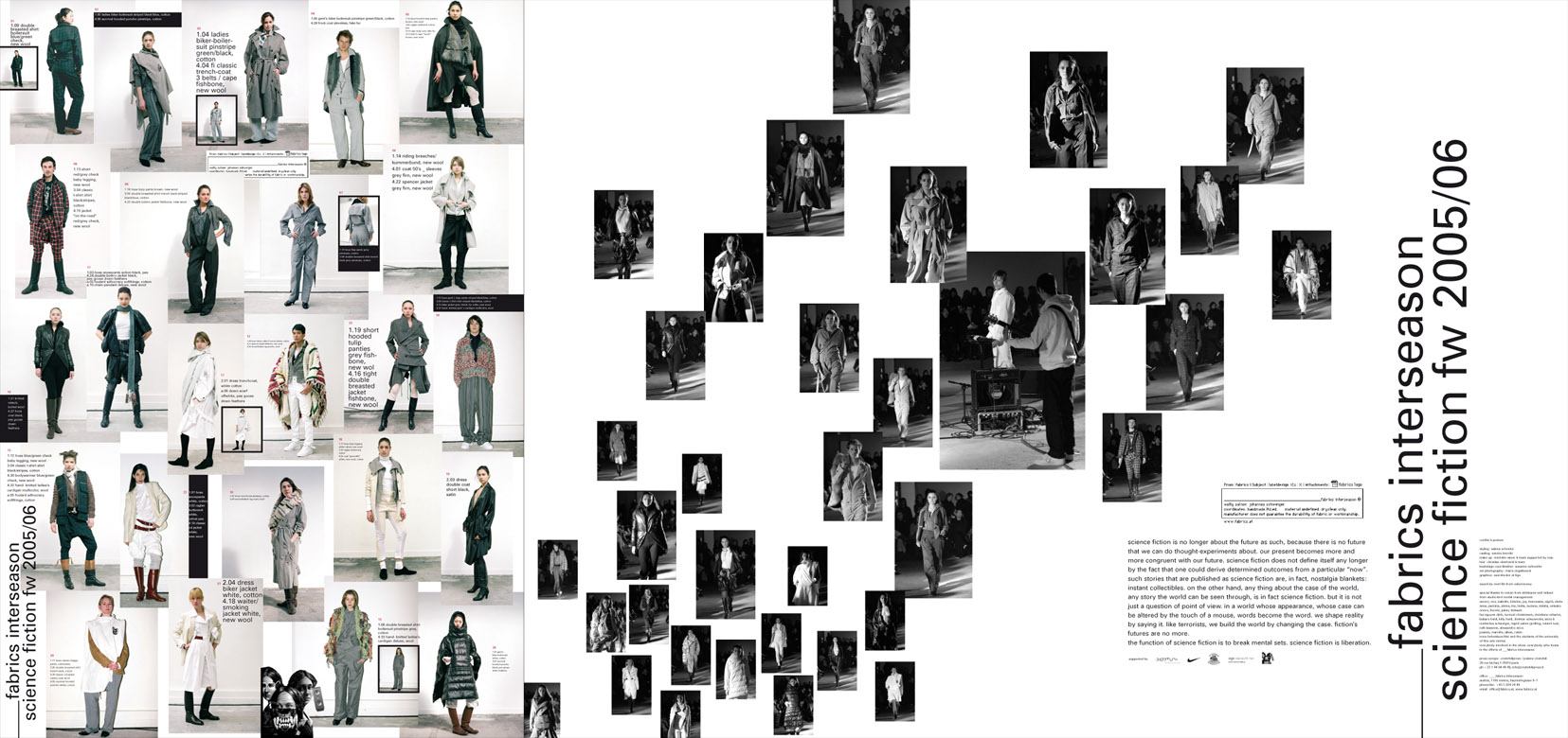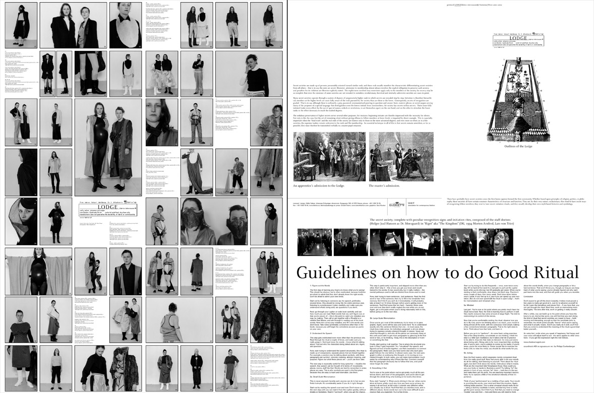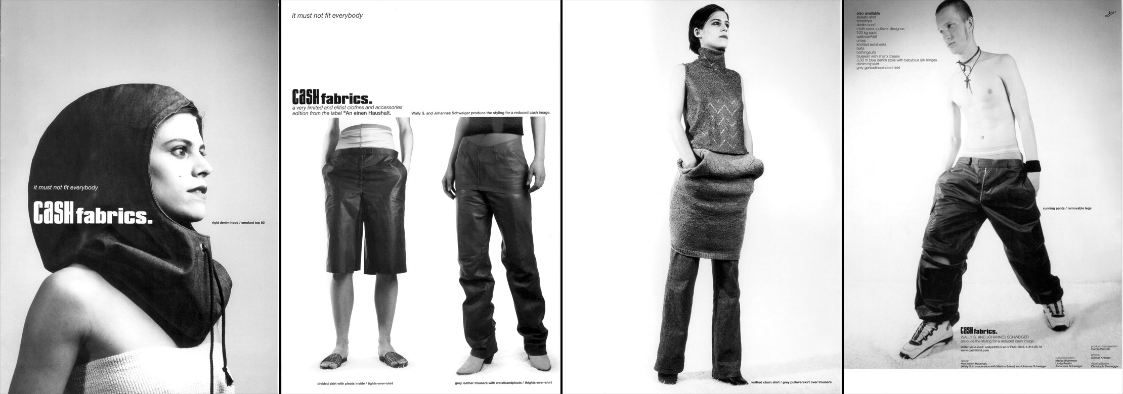 | O-DORF spring summer 07 photography maria ziegelböck, styling sabina schreder | | | PRODUCT PLACEMENT spring summer 06 photography maria ziegelböck, styling natascha hochenegg, graphics susi klocker | | | SCIENCE FICTION fall winter 05/06 photography maria ziegelböck, styling sabina schreder, graphics susi klocker | | | TURBOMÖDELS spring summer 05 photography maria ziegelböck, styling sabina schreder, graphics susi klocker | | | ADHOCRACY fall winter 04/05 photography maria ziegelböck, graphics susi klocker | | | TUPPERWARE spring summer 04 photography maria ziegelböck, graphics susi klocker | | | MENOpause ECONOMICS OF TIME fall winter 03/04 photography maria ziegelböck, graphics susi klocker | | | CONSTRUCTED NORMALITY #CLUB MED/CHLOR spring summer 03 photography maria ziegelböck, graphics susi klocker | | | CONSTRUCTED NORMALITY #MODERN NERVS (FOIE NOIR) fall winter 02/03 photography maria ziegelböck, graphics susi klocker | | | CONSTRUCTED NORMALITY #PROMESSE DU BONHEUR spring summer 02 photography maria ziegelböck, graphics susi klocker | | | LODGE fall winter 01/02 photography maria ziegelböck, graphics susi klocker | | | (visual noise) FEM spring summer 02 graphics susi klocker | | | EQUINOX fall winter 00/01 photography maria ziegelböck, graphics susi klocker | | | SHINJIN RUI 1998 photography ossi haller, graphics christoph steinegger | | | CASH 1998 photography guenther kresser, graphics christoph steinegger | |